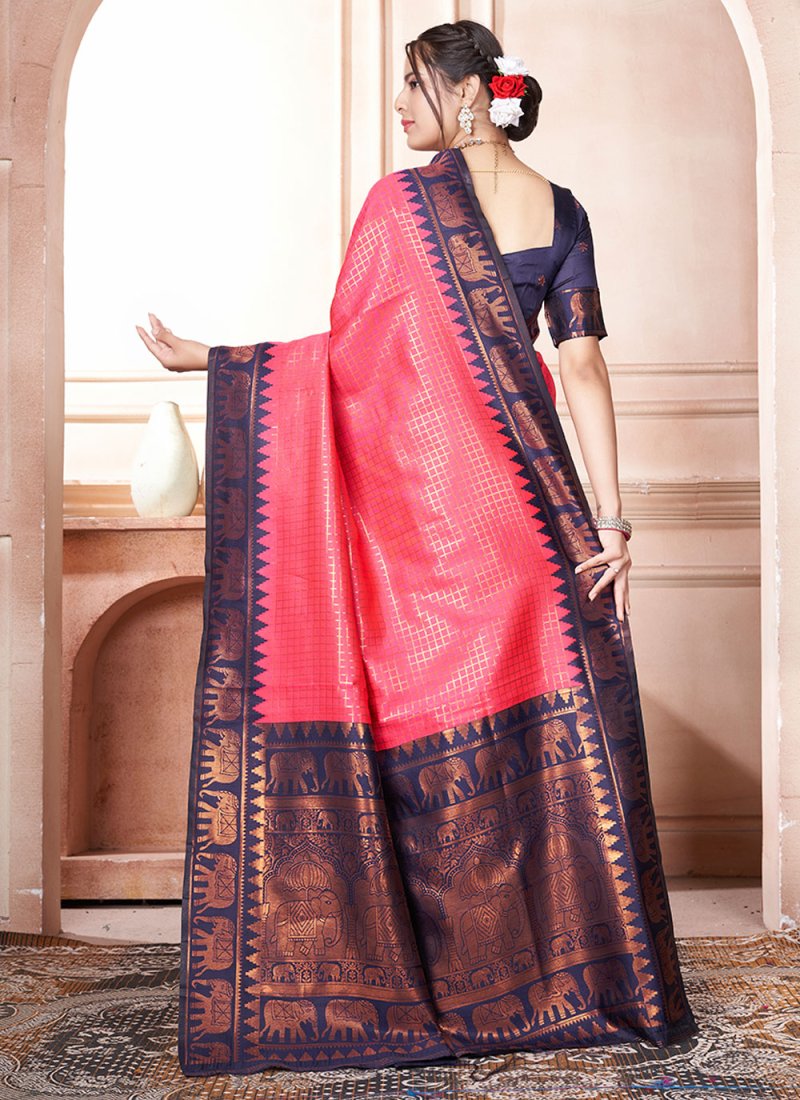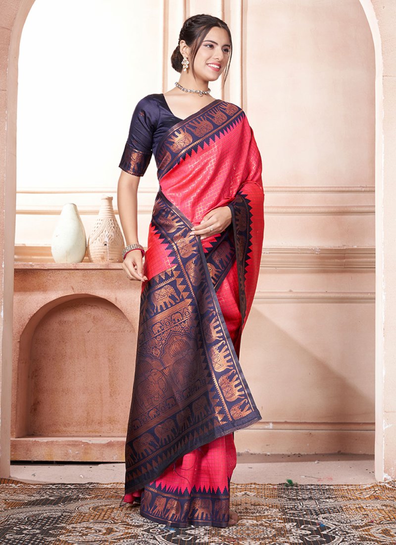 This purple and rani kanjivaram silk classic saree is adding the pretty glamorous displaying the feel of cute and graceful. The woven work appears to be chic and best for any celebration. Comes with matching blouse. (Slight variation in color, fabric & work is possible. Model images are only representative.)