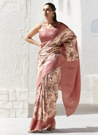Style and pattern would be on the peak of your elegance after you dresses this cream and hot pink art silk contemporary saree. The stunning border, digital print and zari work in the course of the attire is awe inspiring. Comes with matching blouse. (Slight variation in color, fabric & work is possible. Model images are only representative.)