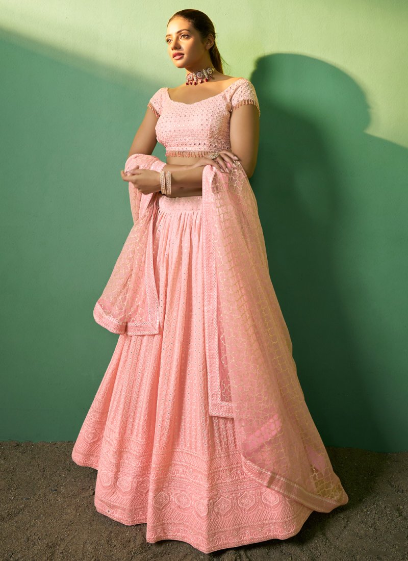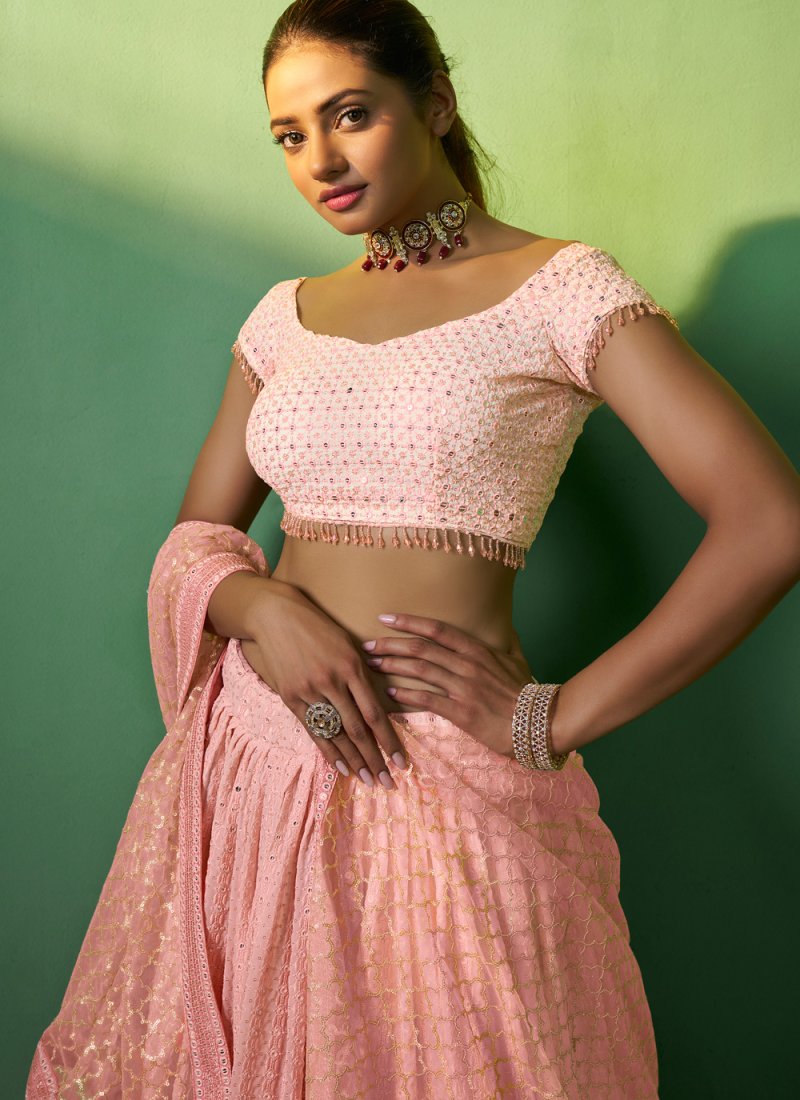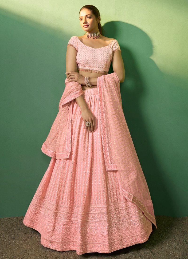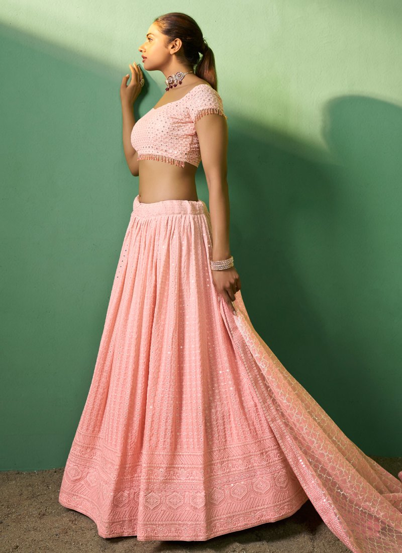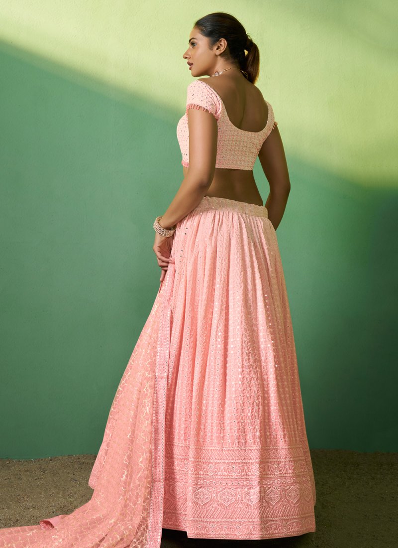 Add grace and charm to your appearance in this enticing peach georgette designer lehenga choli. The ethnic embroidered and sequins work over a clothing adds a sign of splendor statement for the look. Comes with matching choli and dupatta. (Slight variation in color, fabric & work is possible. Model images are only representative.)
