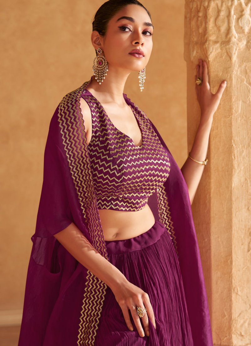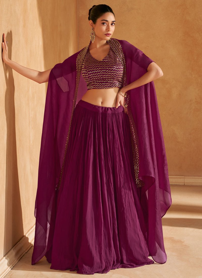 This brilliant array will make you the ultimate classic beauty at the next event you attend. Pamper the women in you with this beautiful purple chinon and silk readymade lehenga choli. Look ravishing clad in this attire which is enhanced plain work. Comes with matching choli and dupatta. (Slight variation in color, fabric & work is possible. Model images are only representative.)