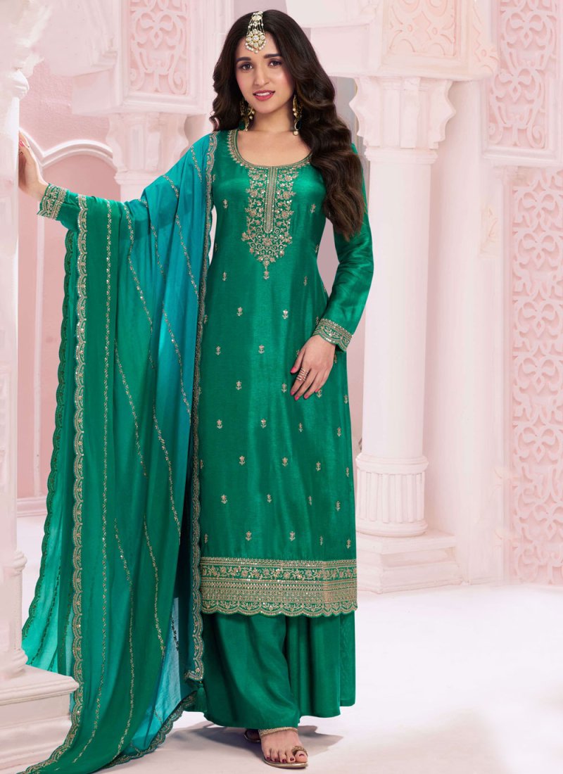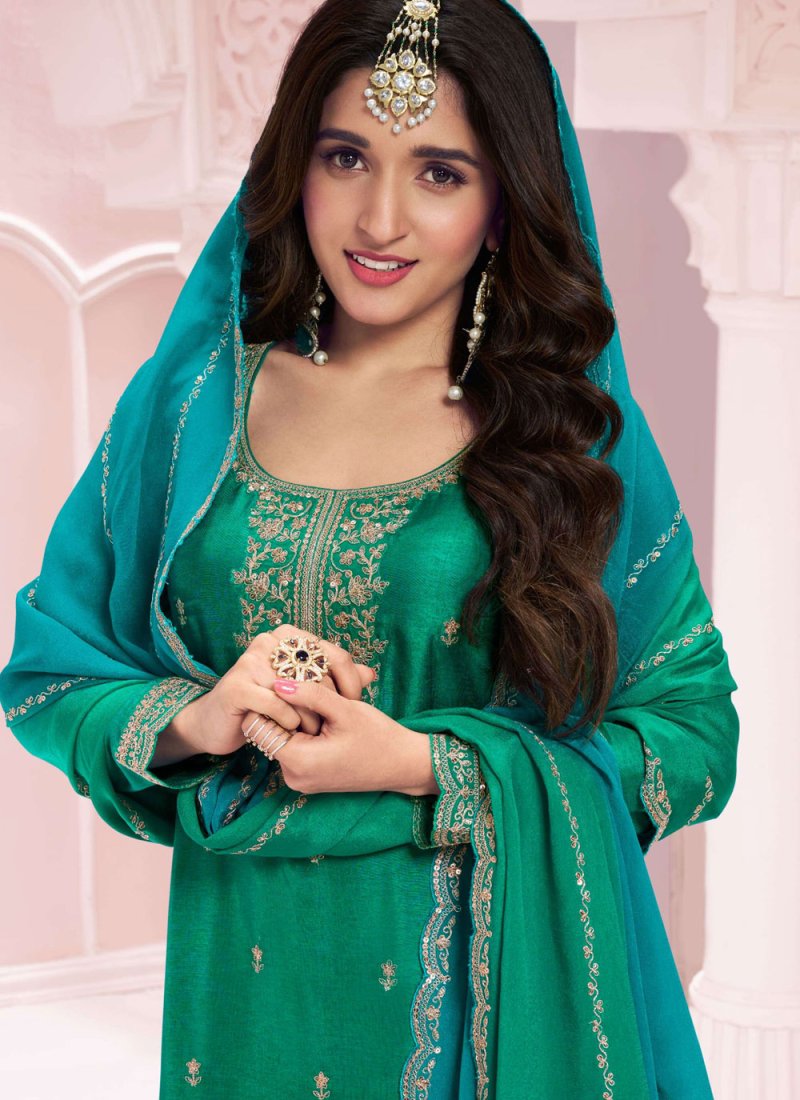 Add a young burst of colour to the wardrobe with this green vichitra silk trendy salwar kameez. The embroidered, sequins and zari work appears to be like chic and ideal for ceremonial, festival and mehndi. Comes with matching bottom and dupatta. (Slight variation in color, fabric & work is possible. Model images are only representative.)