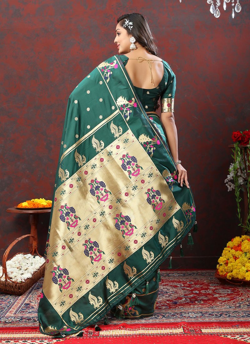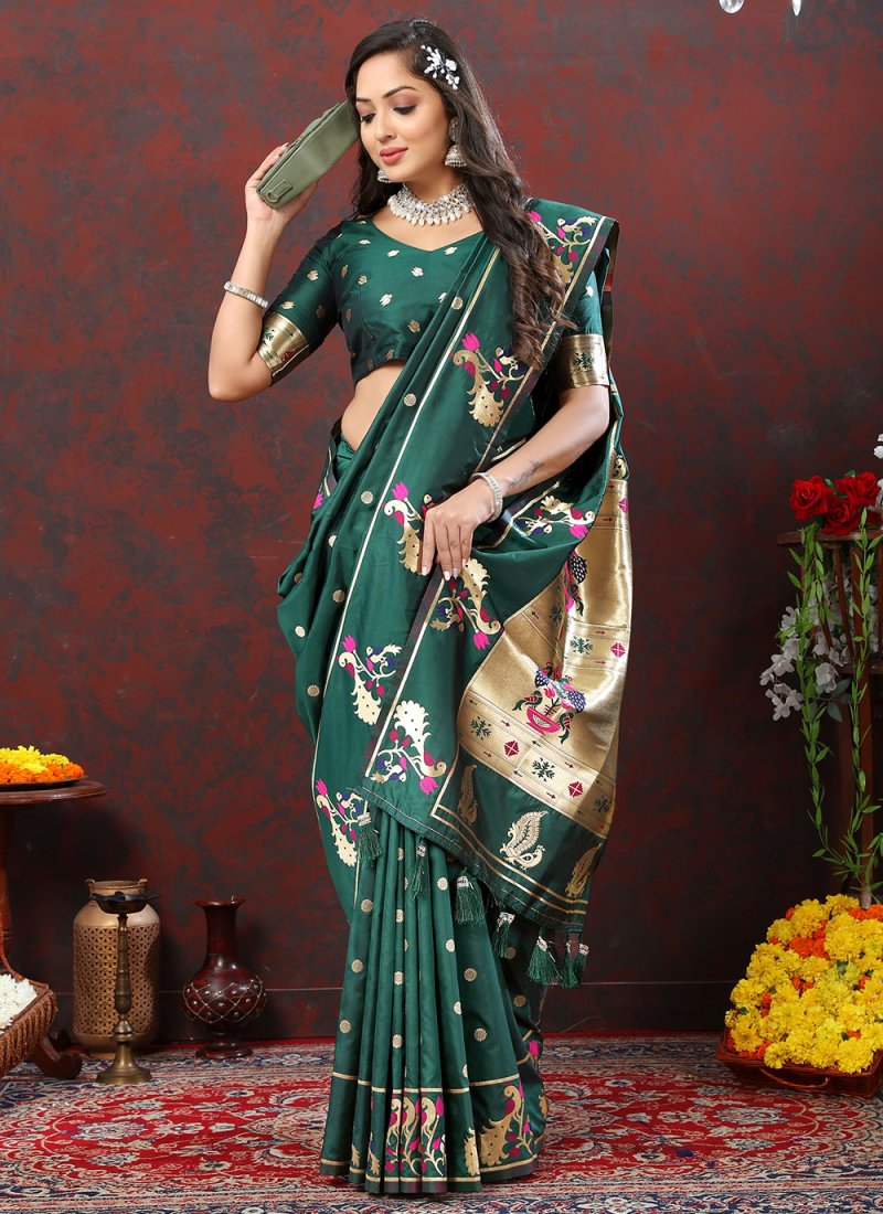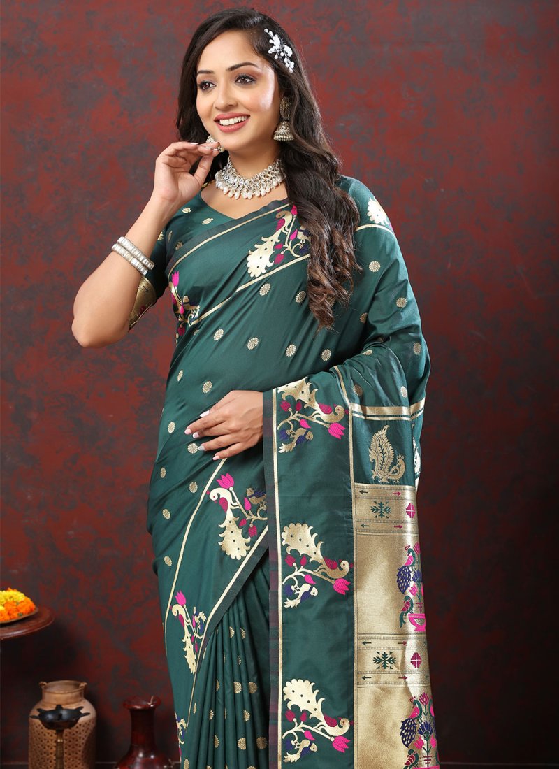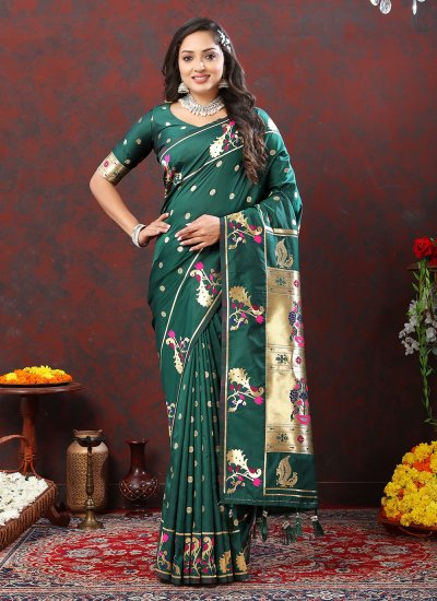 Elegance and honourable come together in this beautiful drape. Be an angel and create a smashing impact on everyone by wearing this green silk trendy saree. You can see some fascinating patterns done with meenakari and weaving work. Comes with matching blouse. (Slight variation in color, fabric & work is possible. Model images are only representative.)