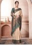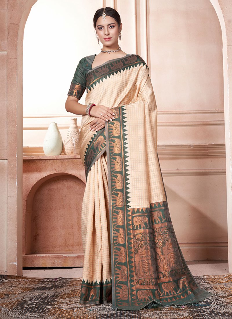 Cream and Green Woven Classic Saree