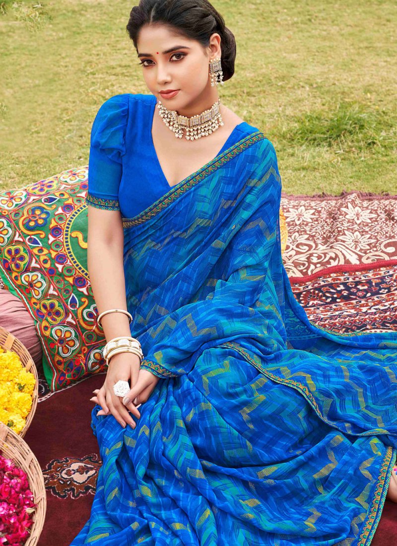 Give in to the exotic confluence of today & tomorrow in this beautiful attire. Be your own style diva with this blue georgette contemporary saree. The printed work on attire personifies the entire appearance. Comes with matching blouse. (Slight variation in color, fabric & work is possible. Model images are only representative.)