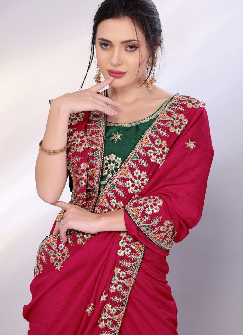 Sensible colors and excellent designs and romantic moods are reflected with an alluring style. Stand out from rest with this rani silk classic saree. This attire is nicely designed with embroidered work. Comes with matching blouse. (Slight variation in color, fabric & work is possible. Model images are only representative.)