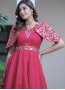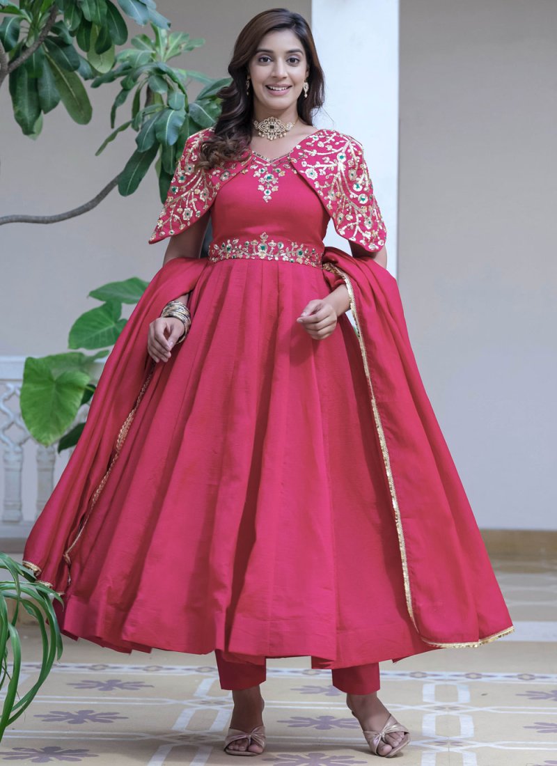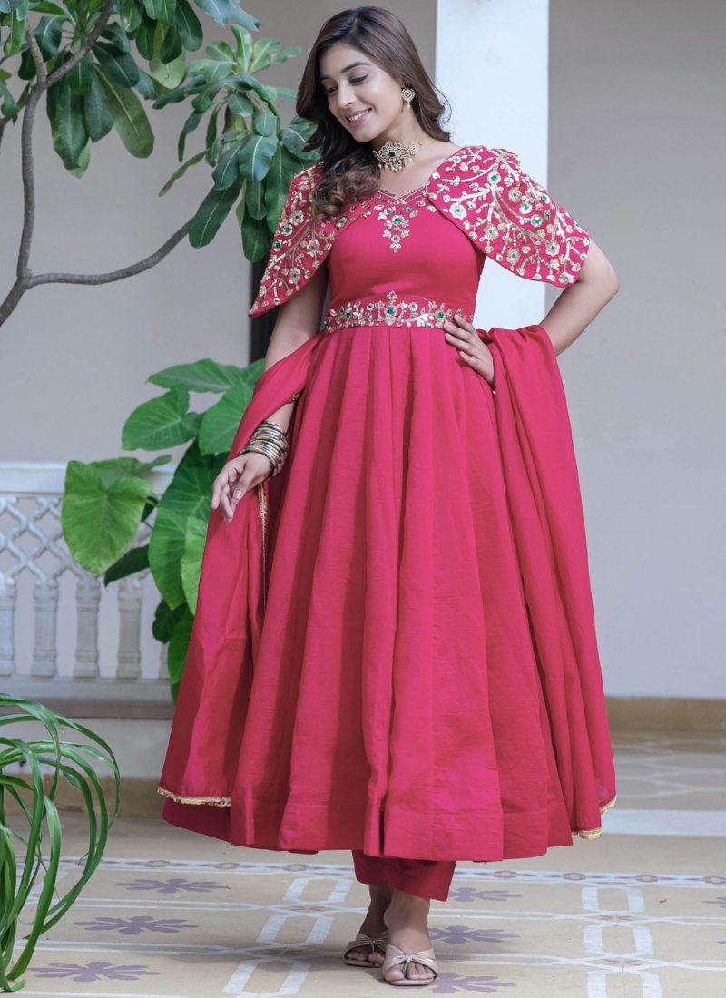 An fantastic rani shimmer and vichitra silk readymade anarkali salwar suit will make you look extremely stylish and graceful. This beautiful dress is showing some terrific embroidery done with embroidered and sequins work. Comes with matching bottom and dupatta. (Slight variation in color, fabric & work is possible. Model images are only representative.)