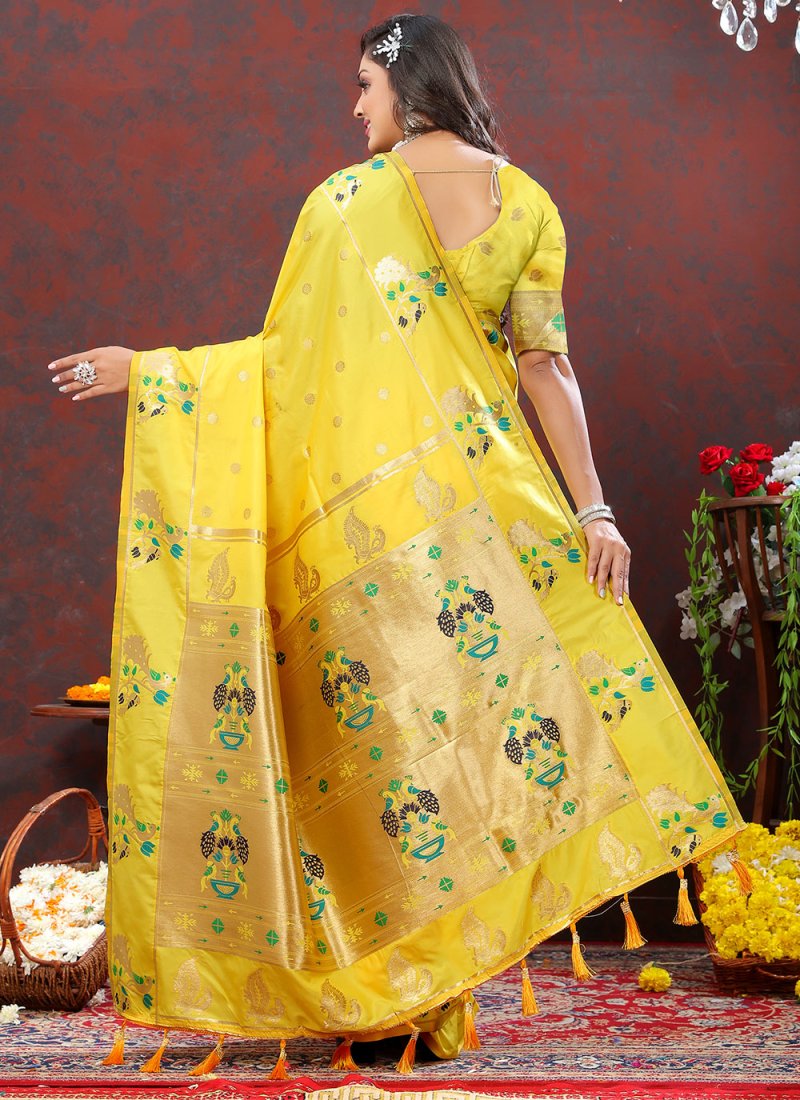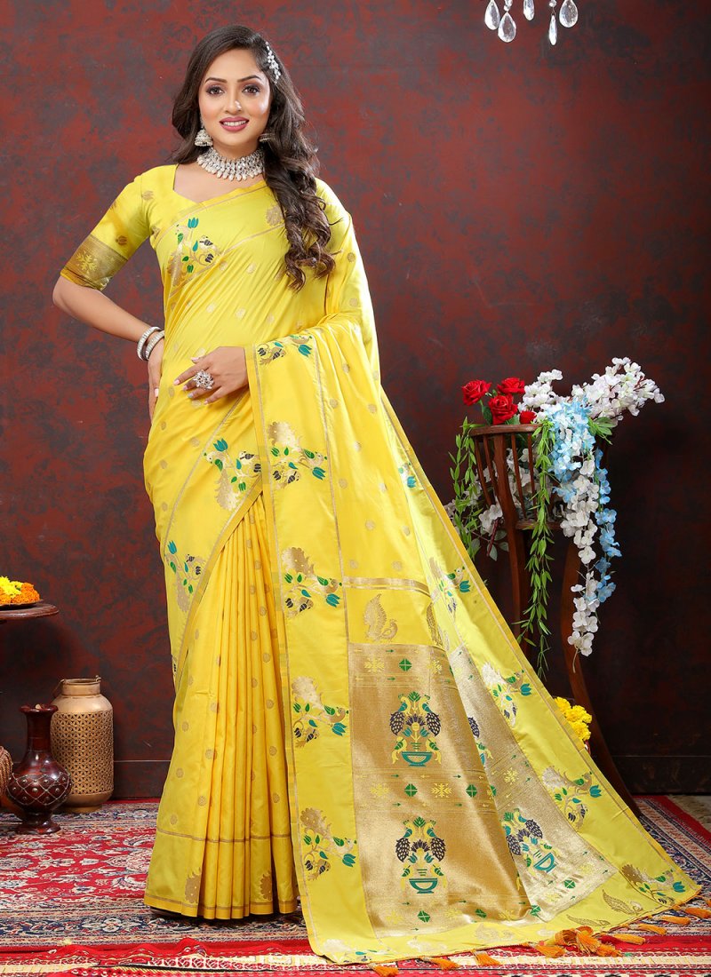 An exceptional yellow silk trendy saree will make you appear extremely stylish and graceful. The ethnic meenakari and weaving work with a attire adds a sign of splendor statement to your look. Comes with matching blouse. (Slight variation in color, fabric & work is possible. Model images are only representative.)